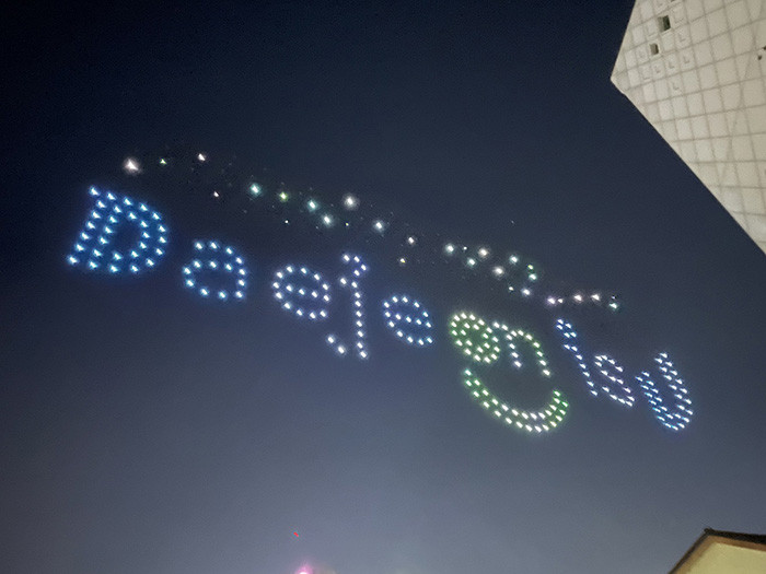 [세계로컬타임즈 민순혜 기자] 대전시는 11월 27일 대전천변 상공에서 대전을 대표하는 상징물과 UCLG 개최 홍보 등 다양한 모양과 글씨를 300여 대의 드론을 활용해 빛으로 표현했다.