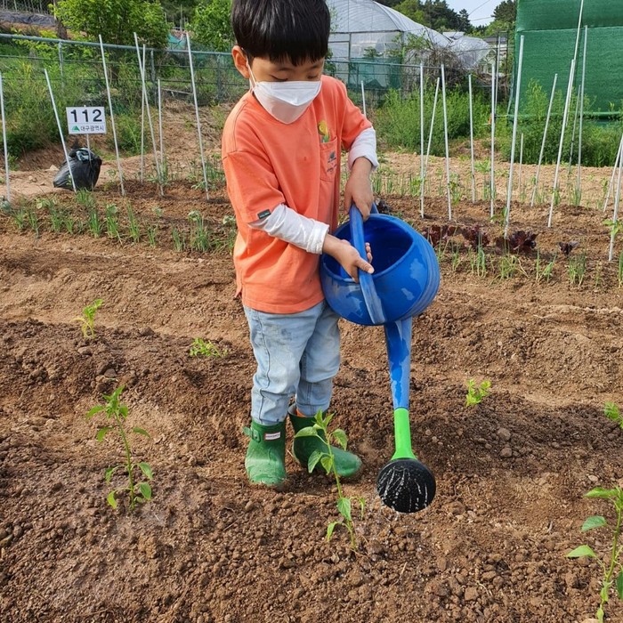 | ▲ 가족과 함께 텃밭에 온 어린이가 모종에 물을 주고 있다. (사진=대구시 제공) |