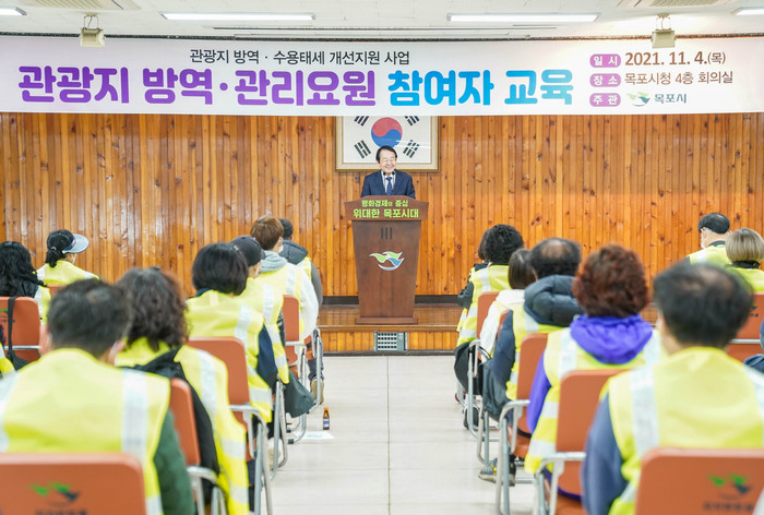 | ▲ 목포시가 주요 관광지에 배치된 관광지 방역ㆍ관리요원 등을 대상으로 위드 코로나 대응 교육을 실시하고 있다.(사진=목포시) |