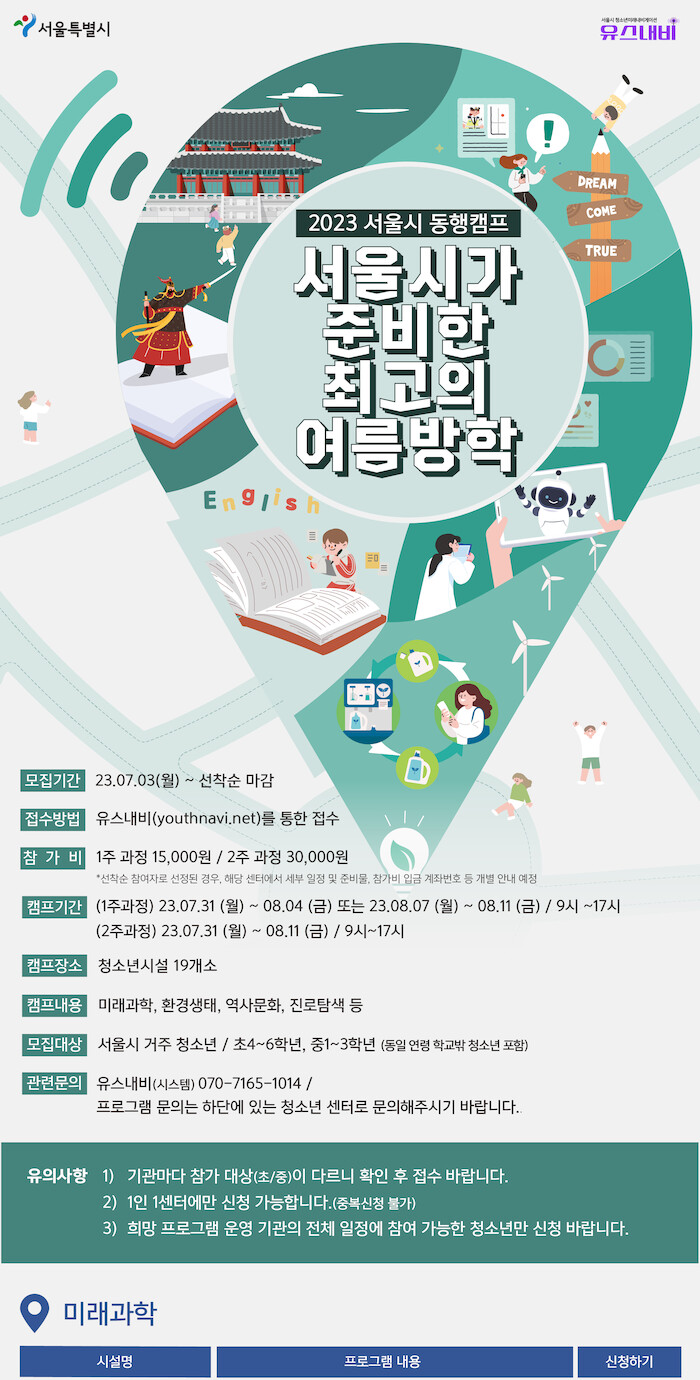 [세계로컬타임즈 이효진 기자] 서울시는 여름방학을 맞아 청소년을 대상으로 다양한 야외 활동 프로그램과 더불어 시원한 실내에서 진로·직업 등을 체험할 수 있는 여름방학 특집 프로그램을 운영한다.