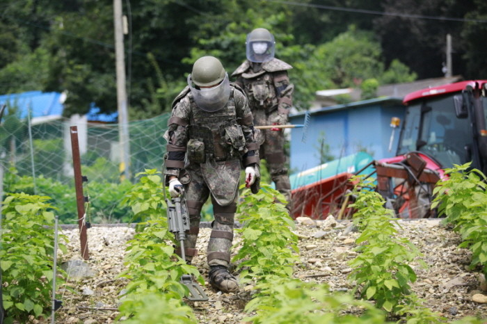 | ▲전문 병력이 지뢰 보호의를 입고 안전을 확보한 가운데 지뢰탐색작전을 실시하고 있다.(사진=6공병여단 제공) |