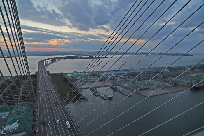 [세계로컬신문 홍윤표 조사위원] 지난 6일 오후 서해대교 주탑에서 바라본 서해바다와 충남 당진항 전경. 해질녘 구름 사이로 비치는 노을이 겨울바다와 어우러지며 아름다운 모습을 연출하고 있다.