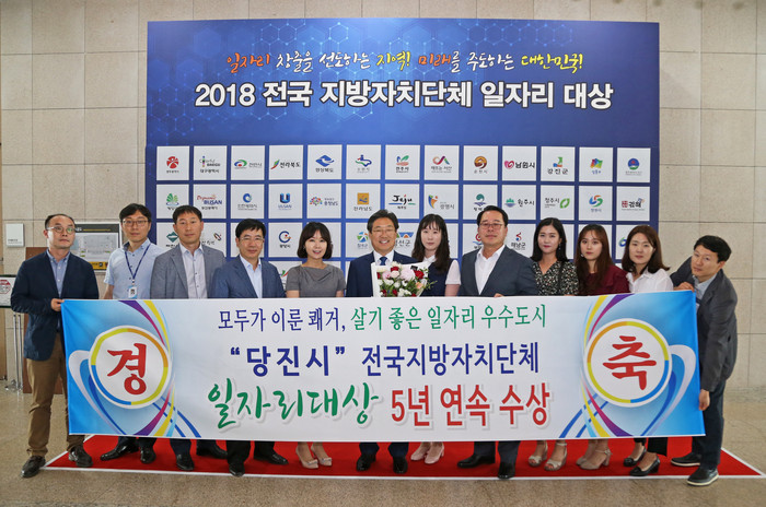 | ▲ '2018 전국 지방자치단체 일자리대상'에서 5년 연속 수상한 '당진시' 관계자들이 기념촬영을 하고 있다. <사진제공=당진시> |