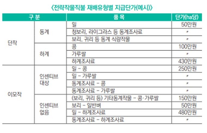 전략 작물 직불제는 벼 재배를 줄이고 밀·콩과 같이 수입에 의존하는 작물 생산을 촉진하고자 올해부터 시작하는 사업으로 기본형 공익직불금에 더해 논에서 전략 작물을 재배하는 농업인과 농업법인에 추가로 제공하는 선택형 직불금이다.
