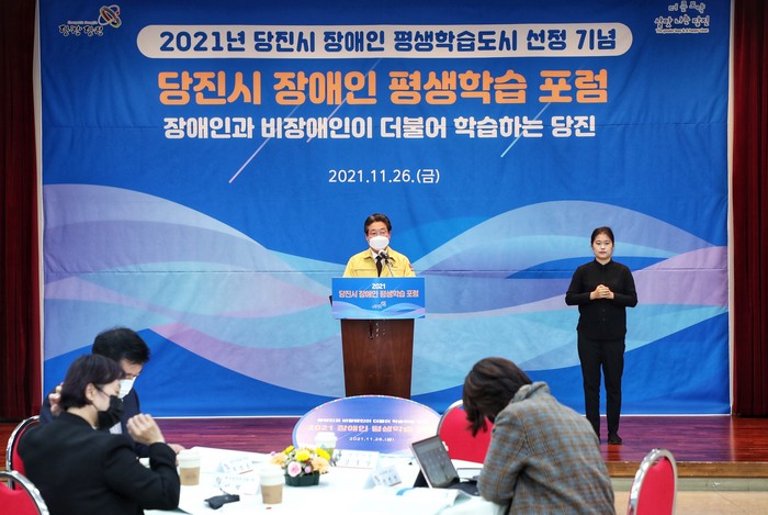 이번 포럼에는 시민 50여명이 현장에 참여한 가운데 당진시청 유튜브를 통해 비대면으로도 시민들이 함께했으며, 이정미 박사(대구경북연구원)의 기조 강연을 시작으로 당진시 장애인 평생학습 현황과 어떠한 정책을 펼쳤는지 시민들과 공유하고 위드 코로나 시대에 평생학습이 나아가야 할 새로운 방향과 해법을 모색하고자 각 분야의 전문가들 토론으로 이뤄졌다.