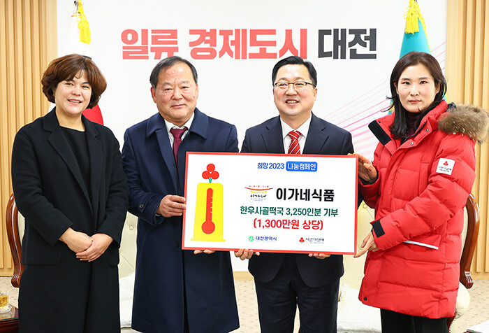 이날 기탁식에는 이장우 대전시장, 이재수 이가네식품 대표, 대전사회복지공동모금회 이은영 사무처장이 참석했다. 연말연시를 앞두고 전달된 이번 물품은 사회복지공동모금회를 통해 대전시 취약계층에게 전달되어 따뜻한 한끼 식사용으로 사용될 예정이다.