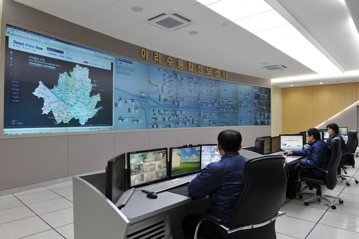 | ▲ 아리수통합정보센터 직원들이 전국 최초로 상수도에 최첨단 IT기술을 접목해 취수에서 수도꼭지까지 아리수의 수량, 수질, 수압 등 모든 정보를 실시간으로 관리하고 있다.<사진제공=서울시 상수도사업본부> |