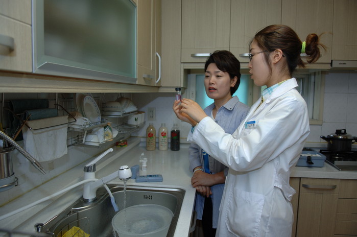 | ▲ 서울시 상수도사업본부 관계자가 일반 가정집의 수도꼭지에서 아리수품질을 확인하기 위해 수돗물을 채취하고 있다. |