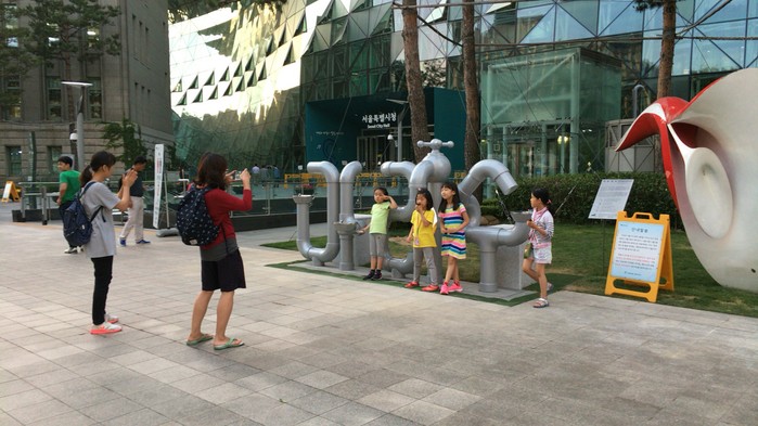 | ▲ 서울광장에 수도관 형상을 딴 아리수 음수대 앞에서 시민들이 기념촬영하고 있는 모습. |