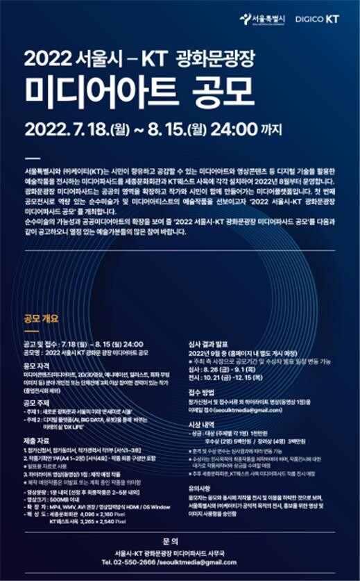 미디어파사드 활성화와 미디어아트 작가 발굴을 위해 공동으로 ‘미디어아트 공모전’을 개최한다. 공모전은 18일부터 8월15일까지 진행하며, 당선작품은 ‘광화문광장 미디어파사드’와 ‘㈜KT사옥 미디어파사드’에 10~12월 중 전시될 예정이다.