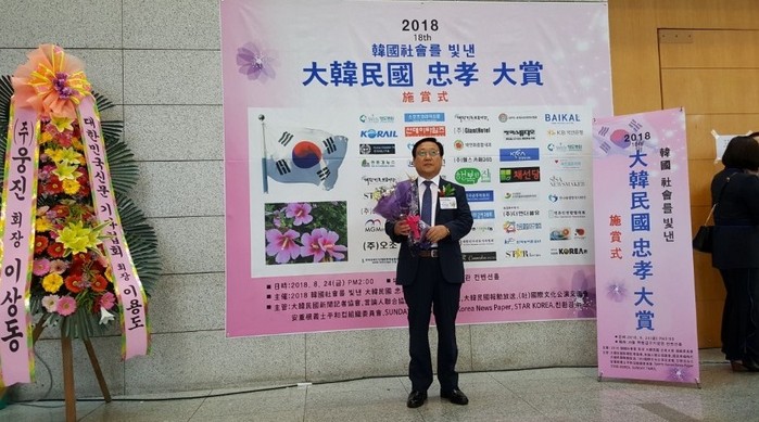 이날 2018년 한국사회를 빛낸 충효대상 조직위원회 대회총재 대한민국 신문기자협회 명예회장 김상천, 대회장 대한민국 신문기자협회 회장 이용도씨가 수여했다.