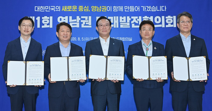 [세계로컬타임즈 최영주 기자] 새로운 경제중심 도약을 위해 영남권 5개 시·도지사가 다시 모여 ‘제1회 영남권 미래발전협의회’를 발족하고 영남권 미래발전에 관한 협력과제에 대해 논의했다.