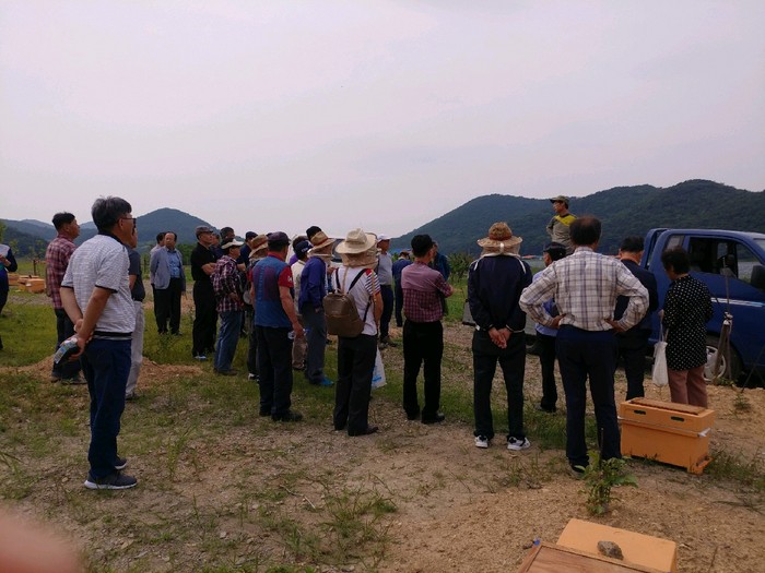| ▲ 19일 당진시농업기술대학 양봉과정 교육생 40명을 대상으로 장원벌 증식 육종장 현장교육을 실시하고 있는 모습. <사진제공=당진시> |