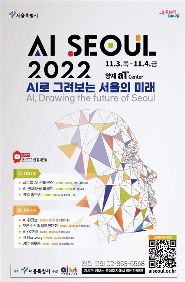서울시는 ‘인공지능으로 그려보는 서울의 미래(AI, Drawing the future of Seoul)’를 주제로 국제 인공지능(AI) 콘퍼런스인 ‘AI SEOUL 2022’를 11월 3일~4일 양재동 aT센터에서 개최한다.