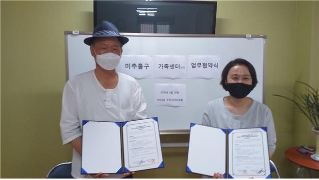 | ▲ 인천시 주안5동 주민자치위와 미추홀구 가족센터가 업무협약식을 갖고 있다. (사진=미추홀구 제공) |