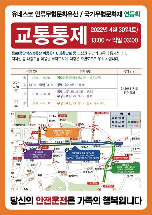 이번 연등행렬 행사 및 중앙버스정류소 이동에 따라 30일과 5월1일 종로 일대의 교통통제가 진행될 예정이다.