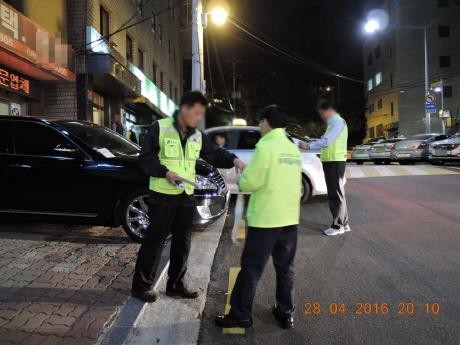 ▲ 서울 강남구가 보도 위 불법 주정차 차량에 대해 고정형 CCTV 157대를 동원해 단속할 예정이다. 사진은 구 관계자들이 야간에 보 도 위 불법주차에 대해 단속활동을 펼치는 모습. <사진제공=강남 구청> |