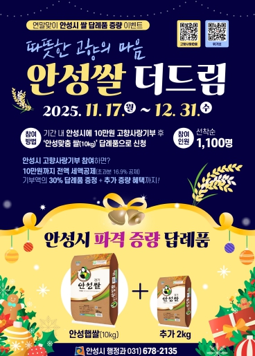 안성시 관계자는 “이번 이벤트는 안성시가 고향사랑기부제를 통해 받은 큰 사랑과 응원에 보답하는 의미에서 마련했으니, 많은 분이 참여해 기부와 지역 농산물 소비 촉진에 함께 해주시길 바란다”라며, “선착순으로 제공되는 만큼, 망설이지 말고 기부를 통해 안성의 맛과 정을 함께 나누길 바란다”라고 전했다.