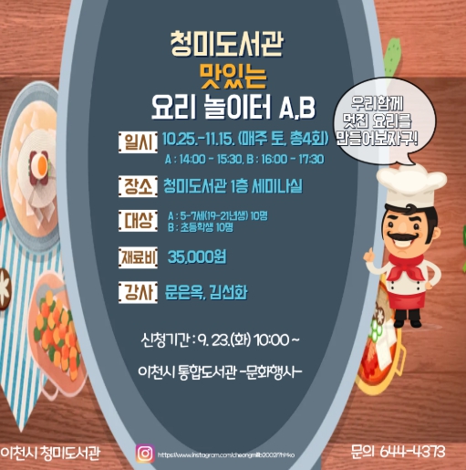 이번 프로그램은 아이들이 직접 요리를 만들며 창의력과 협동심을 기를 수 있도록 마련된 것으로, 5세~7세 유아를 대상으로 하는 A반은 매주 토요일 오후 2시부터 3시 30분까지, 초등학생을 대상으로 하는 B반은 같은 날 오후 4시부터 5시 30분까지 각각 운영된다. 총 4회 과정으로 청미도서관 1층 세미나실에서 진행된다.