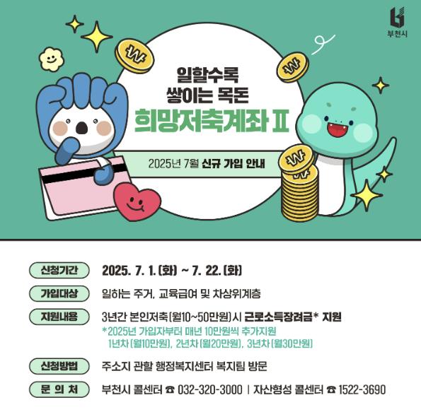 정미연 부천시 복지정책과장은 “희망저축계좌(Ⅱ)는 일하는 저소득층이 자산을 형성할 수 있는 좋은 기회”라며, “대상자들이 적극 참여해 경제적으로 자립하고 안정적인 미래를 준비하길 바란다”고 말했다.