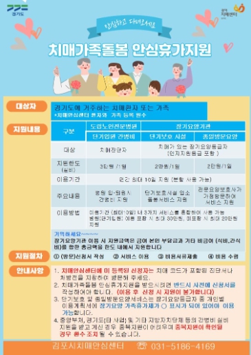‘치매가족돌봄 안심휴가 지원’은 치매로 진단받고 치매안심센터에 등록된 환자와 그 가족을 대상으로 하며, 주민등록상 경기도에 거주하는 도민이면 신청할 수 있다. 지원대상 가족은 치매환자의 배우자, 직계존비속(자녀·부모)의 배우자까지 포함된다.