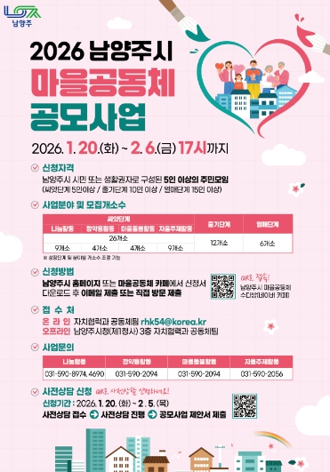 [세계로컬타임즈] 남양주시는 1월 20일부터 2월 6일까지 ‘2026년 마을공동체 공모사업’참여 공동체를 공개 모집한다.