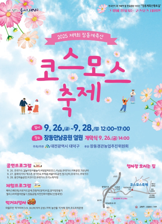 최충규 대덕구청장은 “지역의 자연과 문화, 그리고 주민들의 정성이 함께 어우러져 만들어진 이번 ‘장동계족산 코스모스축제’가 주민과 관광객 모두에게 오래도록 기억될 뜻깊은 시간이 되기를 바란다”며 “많은 분이 찾아와 도심 속에서 가을의 낭만을 만끽하시길 바란다”고 말했다.