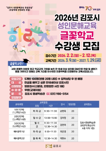 모집 규모는 5개 반, 작년 대비 10명 늘어난 총 100명 내외이며, 모집 대상은 한글을 배우고 싶은 만 18세 이상 김포시민으로 2026년 3월 9일부터 2027년 1월 29일까지 약 1년간 대면 교육으로 진행된다.