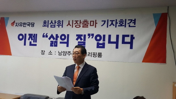 | ▲6일 남양주시청 브리핑 룸에서 최삼휘 남양주시 전 평생교육원장이 남양주시장 출마 기자회견을 하고 있다<사진=고성철 기자> |