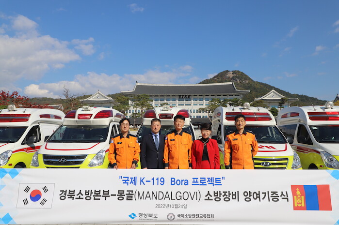[세계로컬타임즈 이장학 기자] 경상북도 소방본부는 지난 24일 도청에서 국제소방안전교류협회와 함께 몽골 응급의료 지원을 위한 불용구급차 10대를 몽골 정부에 무상양여하는 행사를 진행했다고 26일 밝혔다.