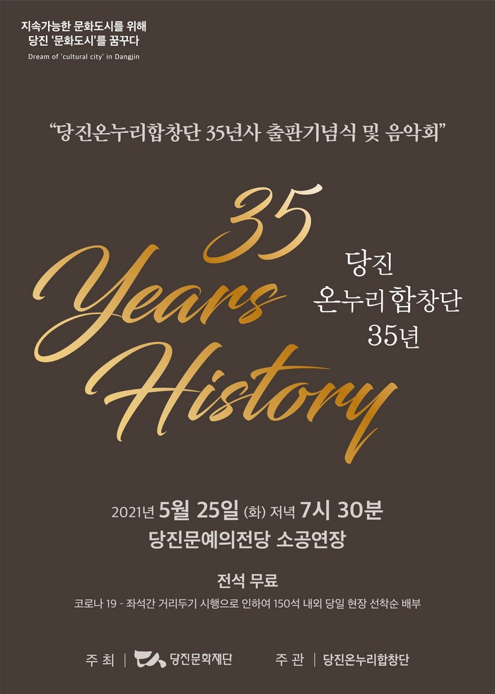 또한 당진문화재단은 ‘당진온누리합창단 35년사’ 출판을 기념하고 축하하기 위해 오는 25일 당진문예의전당 소공연장에서 출판기념식 및 음악회를 열며 앞으로 당진의 문화예술사 발간사업으로 당진문화예술계의 체계적인 역사를 정리하고 다양한 문화예술단체의 활동현황을 기록보존함으로 지역문화 아카이브를 구축하는데 힘쓰겠다고 밝혔다.