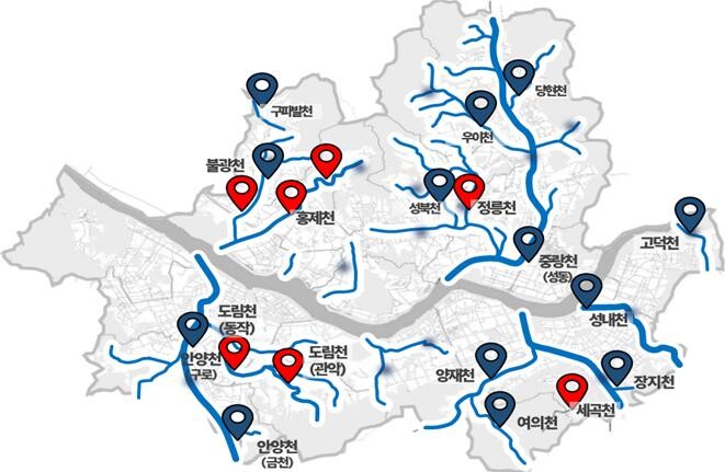▴종로구 홍제천 상류 ▴관악구 도림천 ▴강남구 세곡천 ▴동작구 도림천 ▴서대문구 불광천은 기본 및 실시설계를 마무리하고 4월 중으로 착공, 12월 내 완료된다.