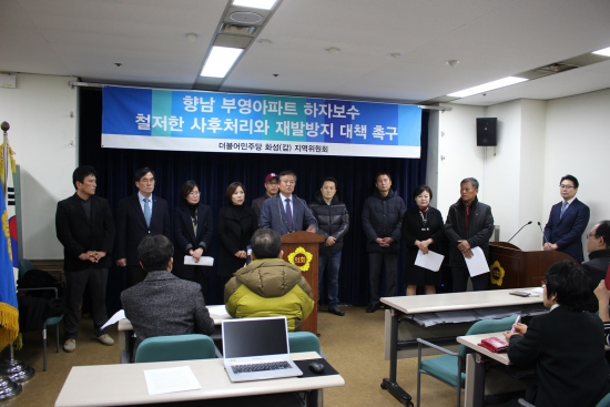 지난 11일 오전 11시 경기도 화성시 향남 부영아파트 입주민대표(구관훈)와 화성시민자치 참여연대, 더불어민주당 화성갑 지역위원장(김용) 등 부영아파트 관계자 20여명이 경기도의회 브리핑룸에서 기자회견을 열고 향남 부영 아파트에 대한 즉각적인 정밀안전진단 검사를 요구했다.