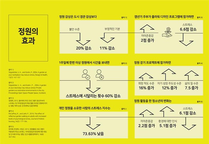 도시가 정원이 되면 시민의 삶이 달라진다. 정원 감상은 도시 경관 감상보다 불안수준을 20% 감소시키며 1주일에 한 번 이상 정원에서 시간을 보내면 스트레스에 시달리는 횟수가 60% 감소한다.