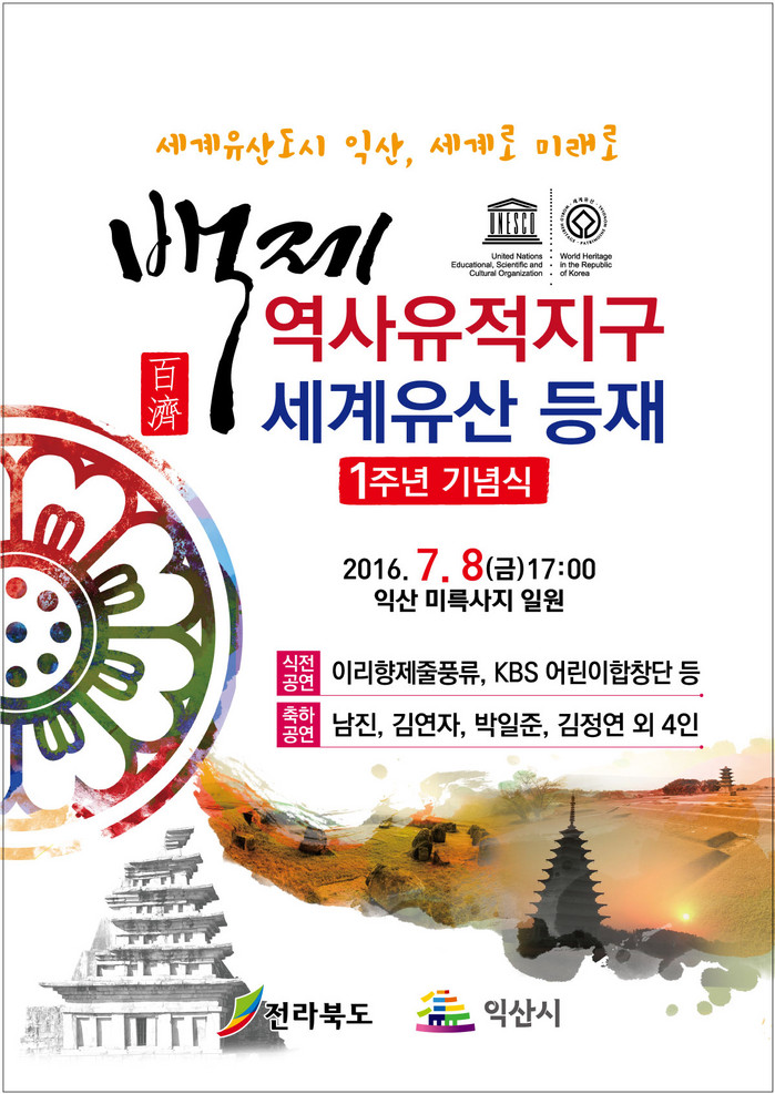 같은 날 미륵사지에서는 각계 각층의 주요인사와 시민 등 1000여명이 참가한 가운데 ‘유네스코세계유산의 도시 익산 세계로 미래로’를 주제로 ‘백제역사유적지구 세계유산 등재 1주년 기념식’이 진행된다.