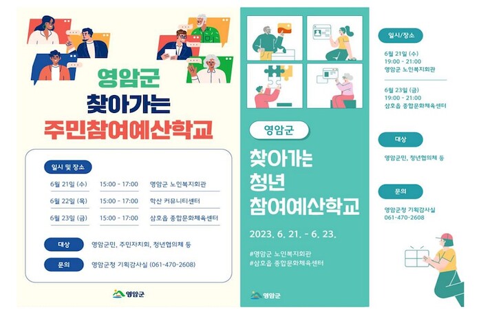 [세계로컬타임즈 최진기 기자] 전남 영암군이 ‘2023년 찾아가는 주민·청년참여예산학교’를 오는 21~23일 운영한다. 이번 학교는 지방재정 운용과정에 대한 주민의 이해를 돕고, 주민·청년참여예산제도 참여를 보장하기 위해 마련됐다.