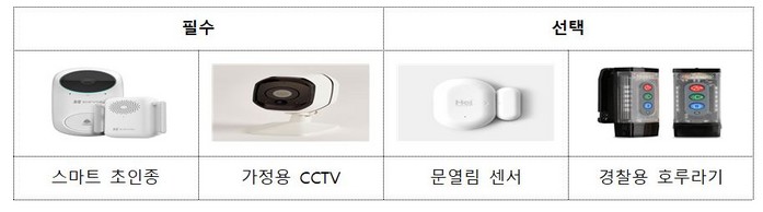실외 보안용으로 귀가 전후 휴대폰으로 현관 상황을 실시간 확인할 수 있는 ‘스마트 초인종’과 실내 보안용으로 외출 시 가정 내 상황을 확인할 수 있는 ‘가정용 CCTV’가 지원된다. 또한, 문열림센서와 경찰용 호루라기 중 1개를 선택해서 지원받을 수 있다.