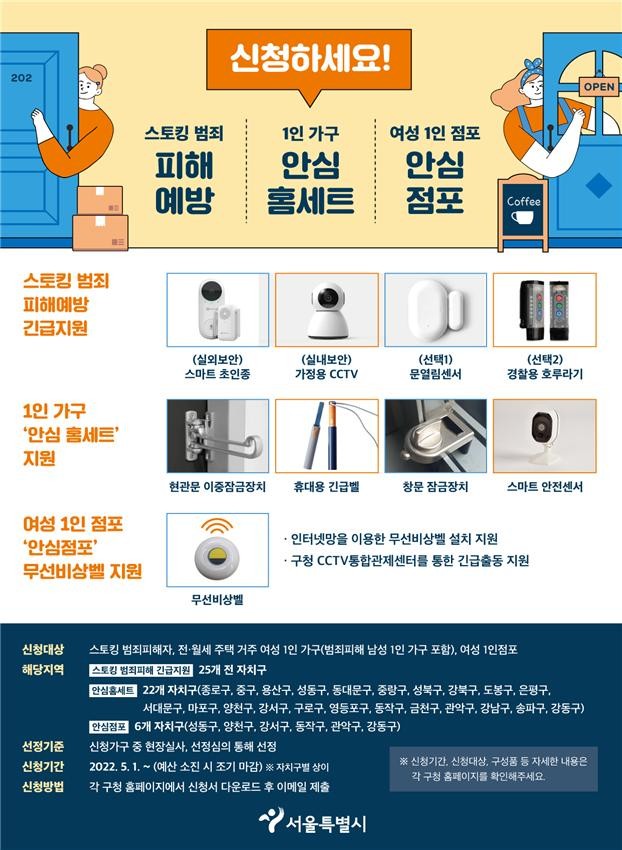 서울시는 스토킹 범죄 피해자나 스토킹 범죄 위험에 노출돼 신변보호대상자로 지정된 시민들이 보다 안심하고 생활할 수 있도록 주거침입을 예방하는 ‘안심장비 3종’을 지원한다. 그동안 여성 1인가구, 여성 1인점포에 이중잠금장치, 비상벨 등 안전장치를 지원한 데 이어 지원 대상에 스토킹 범죄 피해예방 분야를 새롭게 포함하는 것이다.