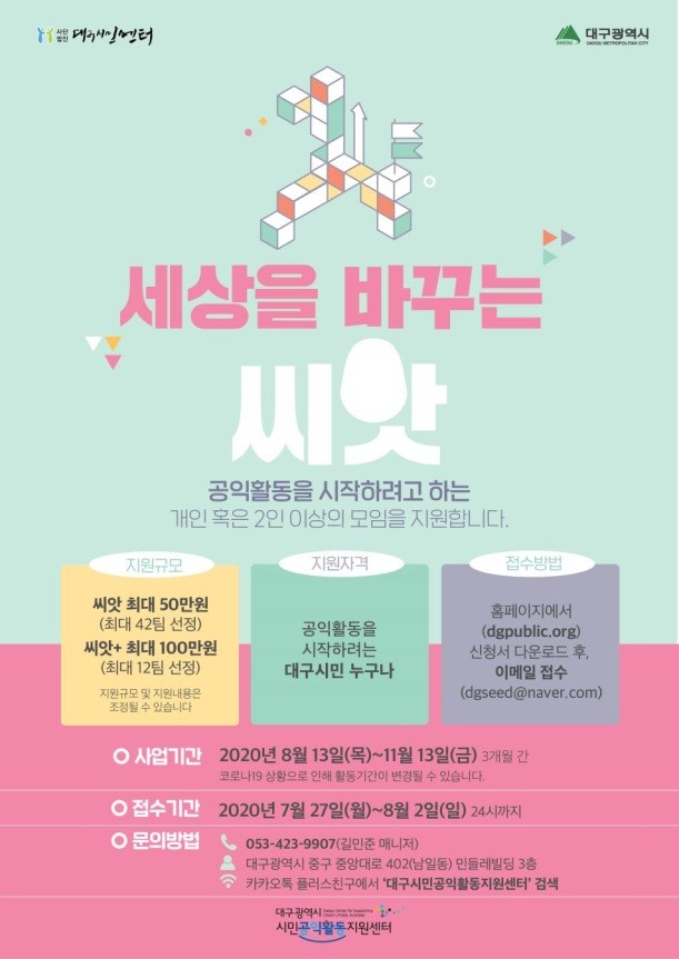 신청 기간은 7월 7일부터 8월 2일까지이며 대구시 시민공익활동지원센터 홈페이지(dgpublic.org)에서 신청서를 내려받아 작성 후 이메일(dgseed@naver.com)로 제출하면 된다.
