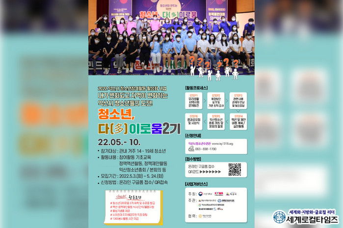 [세계로컬타임즈 조주연 기자] 전북 익산시가 ‘청소년 다이로움 2기’ 프로그램 참가자 50명을 오는 24일까지 모집한다.