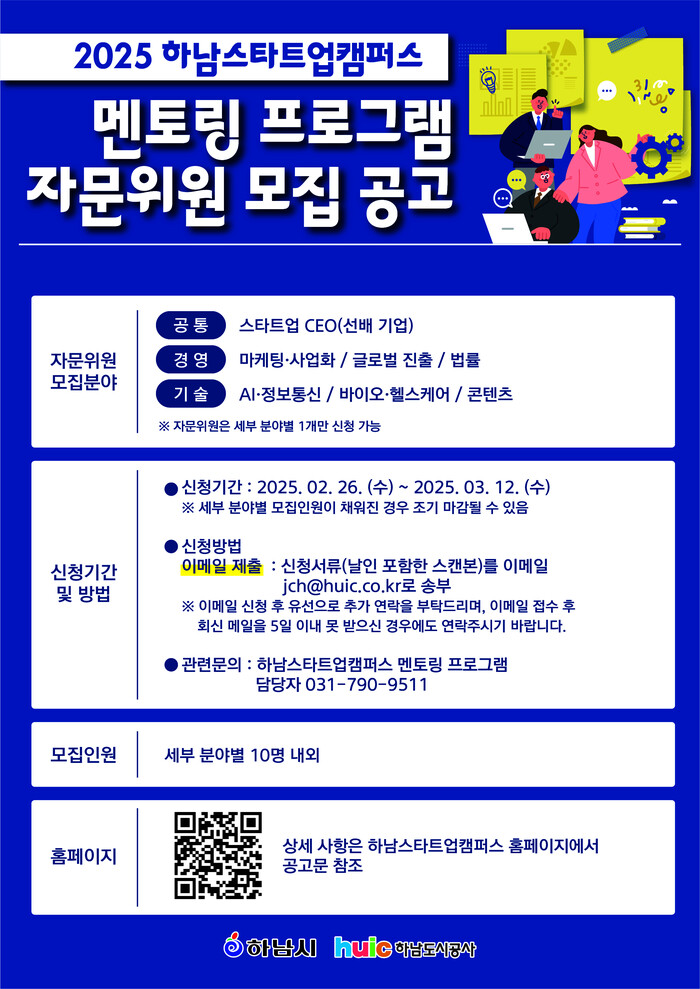 [세계로컬타임즈] 하남시와 하남도시공사(하남스타트업캠퍼스)는 지역 내 창업 생태계 활성화와 스타트업의 성공적인 성장을 지원하기 위해 멘토링 자문위원을 3월 12일까지 공개 모집한다고 밝혔다.