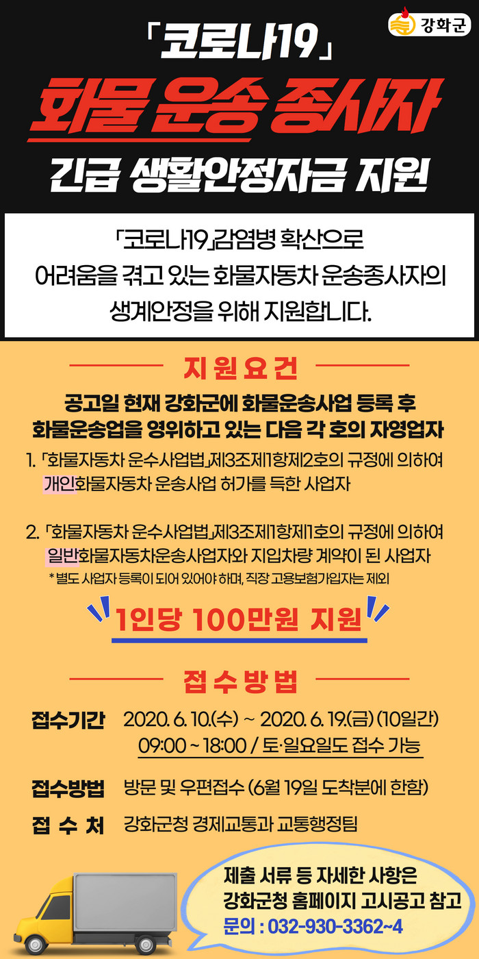 [세계로컬타임즈 유영재 기자] 강화군은 코로나19 여파에 따른 운송 수입 감소로 어려움을 겪는 화물운수사업자에게 1인당 100만 원의 긴급생활안정자금을 지원한다.