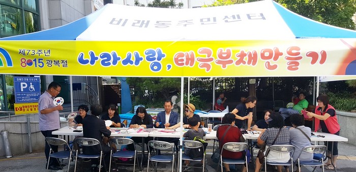 | ▲ 대전 대덕구 비래동주민지치위원회가 13일 제73주년 광복절을 맞이해 주민들과 광복의 의미를 되새기는 태극기사랑 체험행사를 진행하고 있다. |