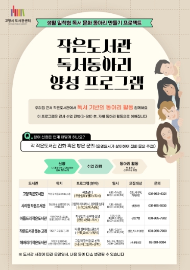이번 프로그램은 고양시 도서관센터가 관내 작은도서관을 대상으로 기획한 협력 사업으로, 선정된 5개 도서관은 독서 기반의 창의적이고 특색 있는 주제를 중심으로 강사와 함께 활동을 시작하며, 이후 자생적인 동아리로 전환해 운영을 이어갈 예정이다.