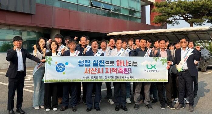 간담회 후 청렴 교육과 ‘청렴한 서산, 깨끗한 서산’란 표어와 함께 서산시청 직원과 한국국토정보공사 서산지사 직원 간‘청렴 측량 및 토지이동조사 허가증’을 직접 걸어주며 합동 청렴실천 결의대회를 진행했다.