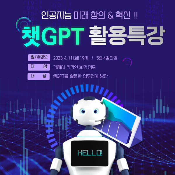 [세계로컬타임즈 조주연 기자] 전북 김제시립도서관이 시민을 대상으로 오는 11일 ‘챗GPT를 활용한 직장인 특강’을 실시한다.