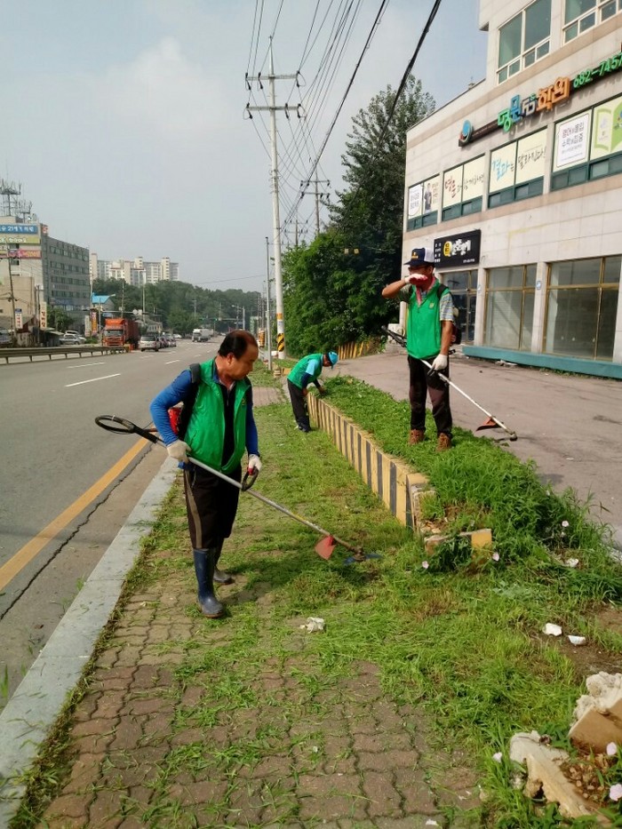 | ▲ 평택시 포승읍 새마을지도자회 회원들이 25일 도로변에 자란 잡초를 깎고 있다.<사진제공=평택시청> |