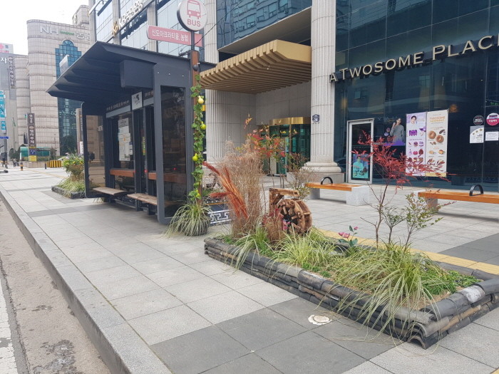 이러한 버스정류장 주변 공간에 생화를 설치해 시민들에게 녹지공간을 제공하고, 한국의 전통적 특징인 기와·물레방아·지게로 독특함을 더했다.