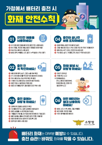 이에 광명소방서는 시민들이 지켜야 할 안전수칙으로 ▲충전 완료 후 전원 차단 ▲손상된 배터리 사용 금지 ▲외출 시 충전 금지 ▲습도 높은 장소 보관 금지 ▲과충전·과열 주의 등을 당부했다. 또한 사용 중 연기나 불꽃, 타는 냄새가 발생할 경우 즉시 사용을 중단하고 119에 신고해야 한다고 강조했다.