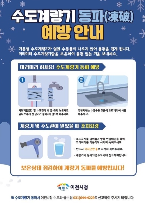 이천시는 동파 취약지역 점검과 함께 동파 예방 안내를 위한 홍보지를 배부하고 현수막을 게시하며 동파 발생 시 신속한 복구를 위한 비상근무체제에 돌입했다.